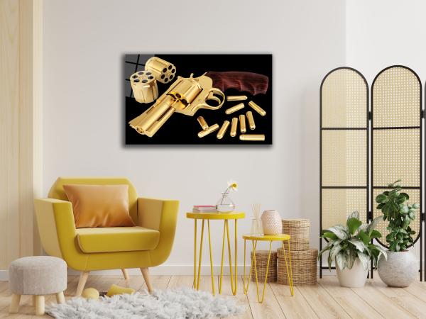 Goldener Revolver Art Design rechteckiges spezial Glasbild!